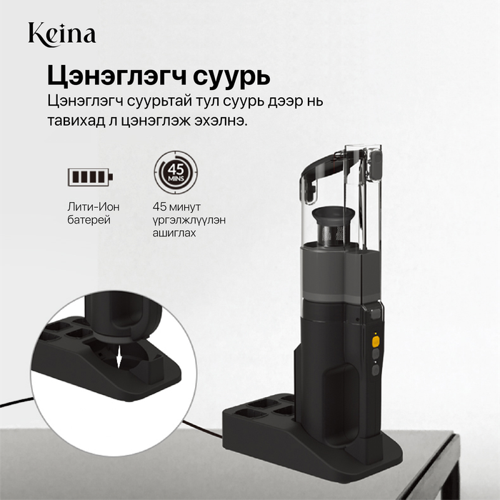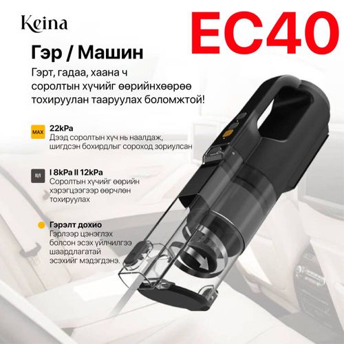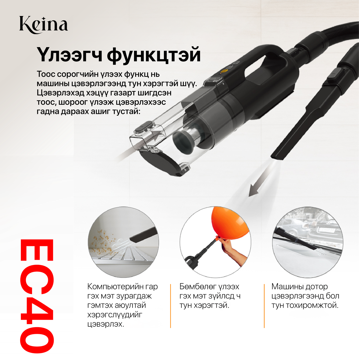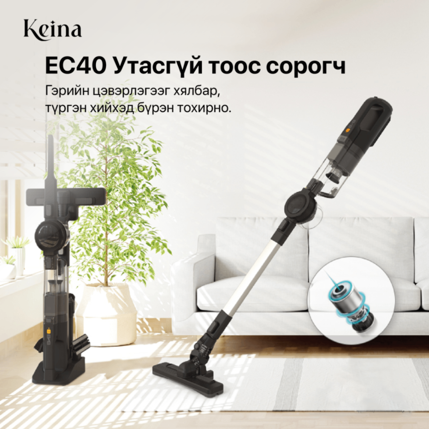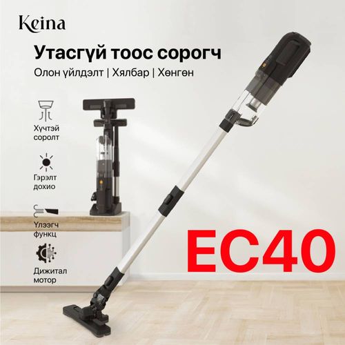 Keina EC40 Олон үйлдэлт утасгүй тоос сорогч нь хүчтэй мотор, Stainless Steel шүүлтүүр, өндөр хүчин чадал бүхий батерей, соролтын хүчийг тохируулах боломж бас тэгээд утасгүй.