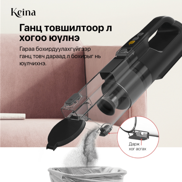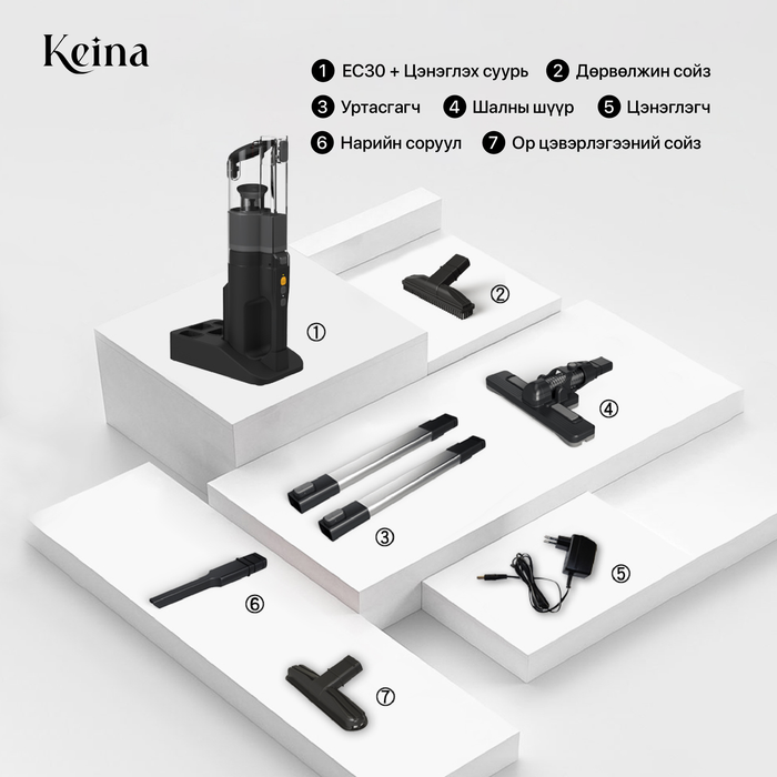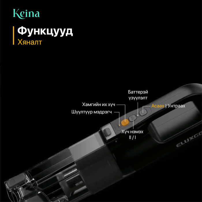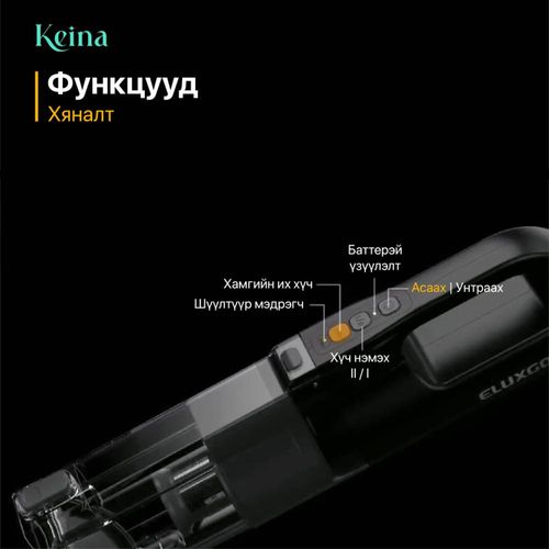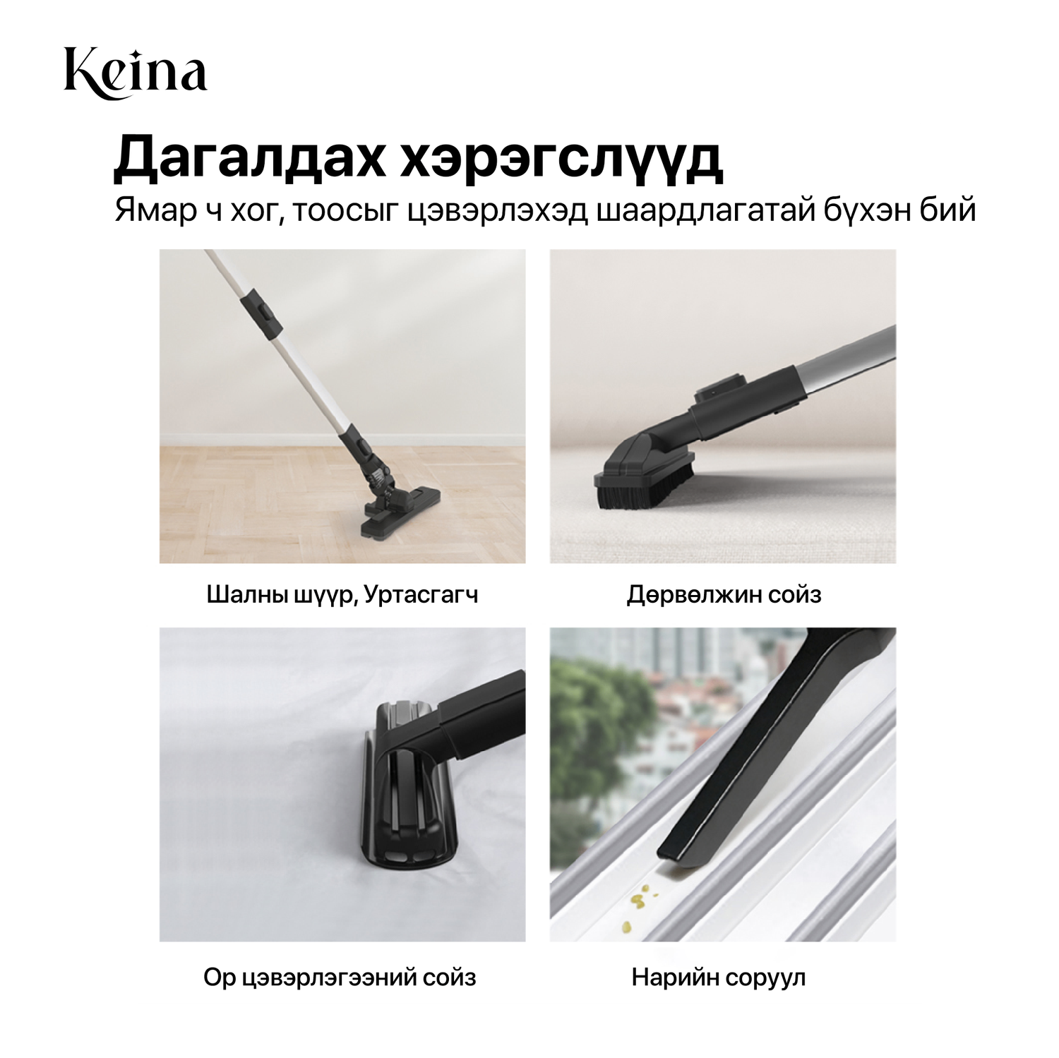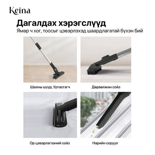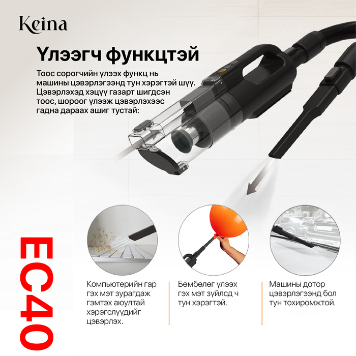 Keina EC40 Олон үйлдэлт утасгүй тоос сорогч нь хүчтэй мотор, Stainless Steel шүүлтүүр, өндөр хүчин чадал бүхий батерей, соролтын хүчийг тохируулах боломж бас тэгээд утасгүй.