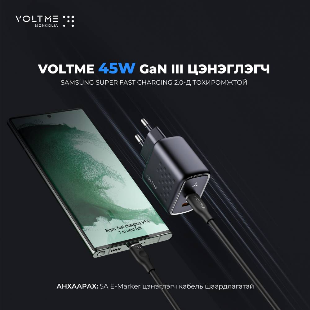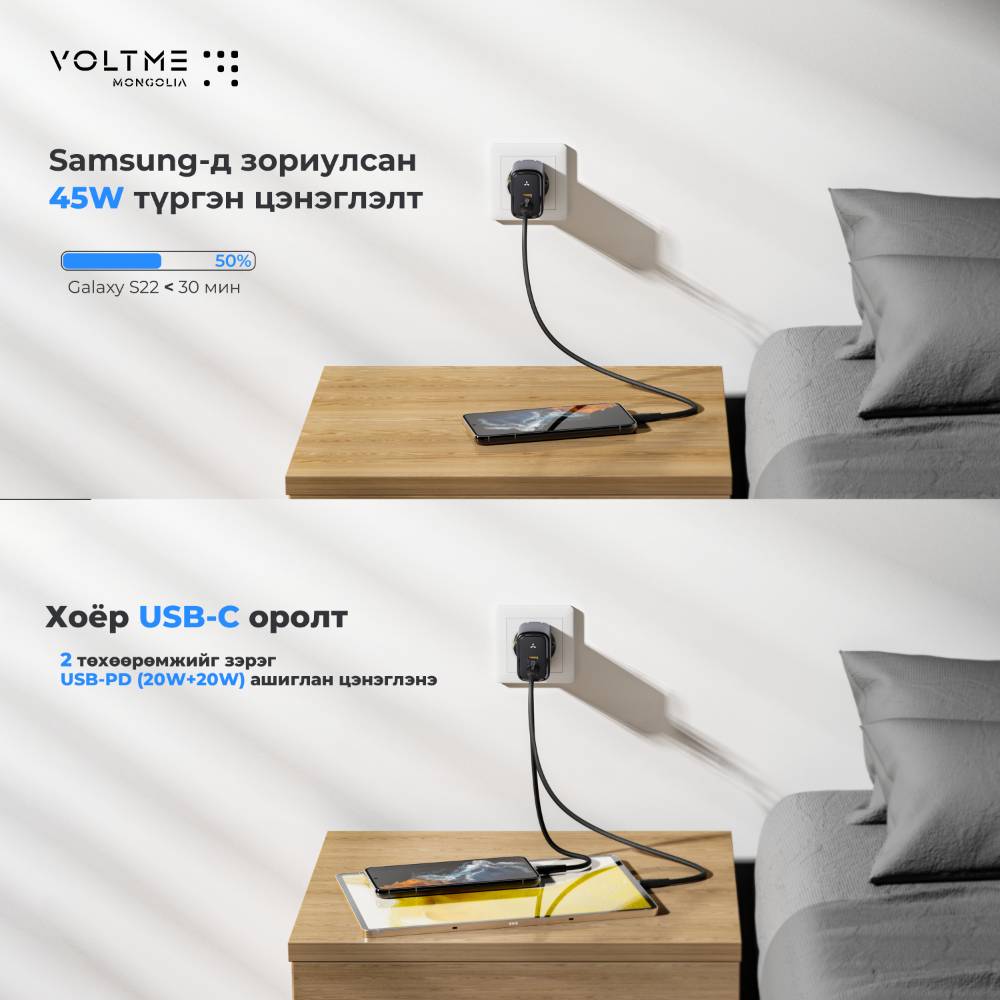 VOLTME брэндийн цэнэглэгч USB-C болон USB-A оролтын тусламжтайгаар зөөврийн компьютер, таблет, ухаалаг утас, чихэвч гэх мэт төхөөрөмжийг цэнэглэх боломжтой.