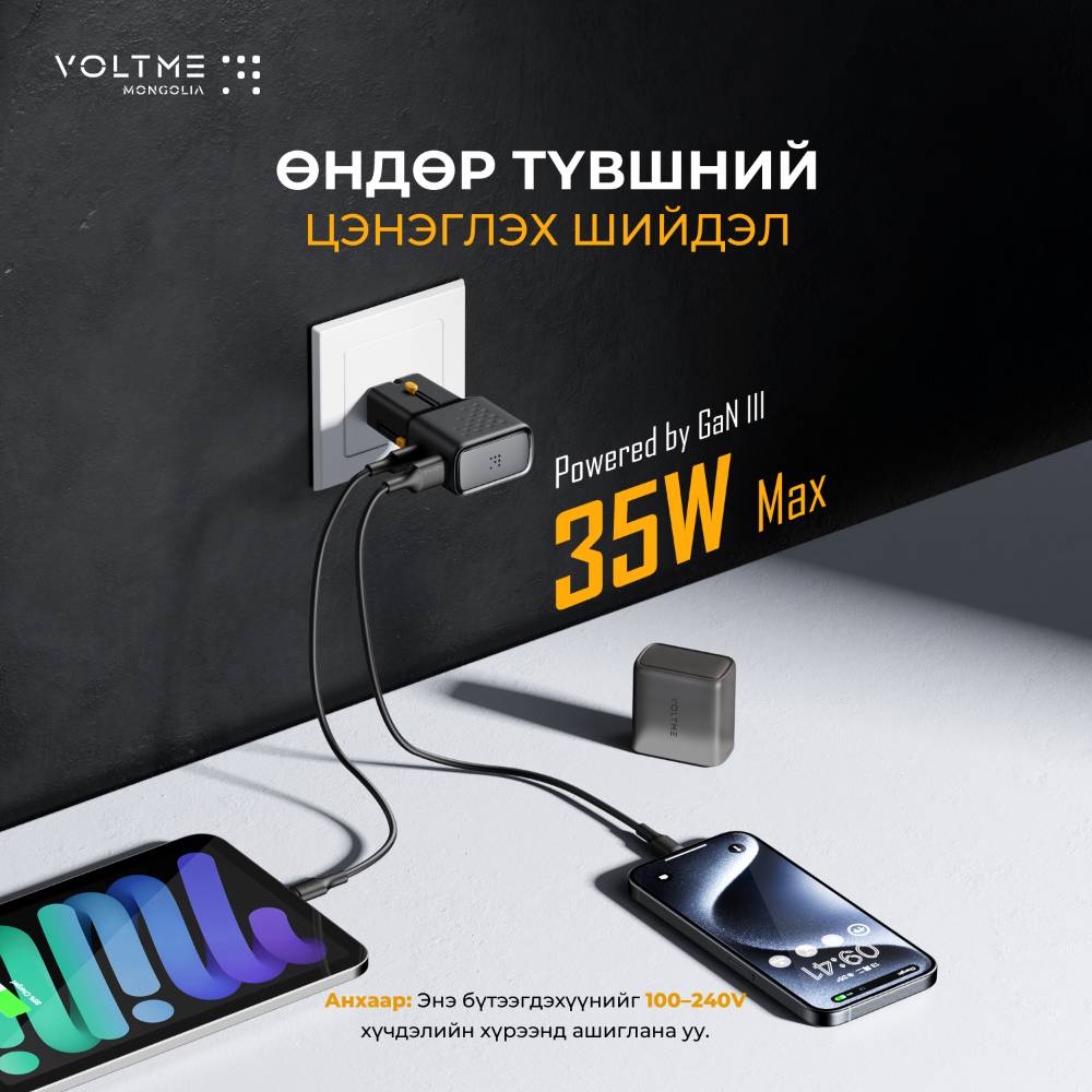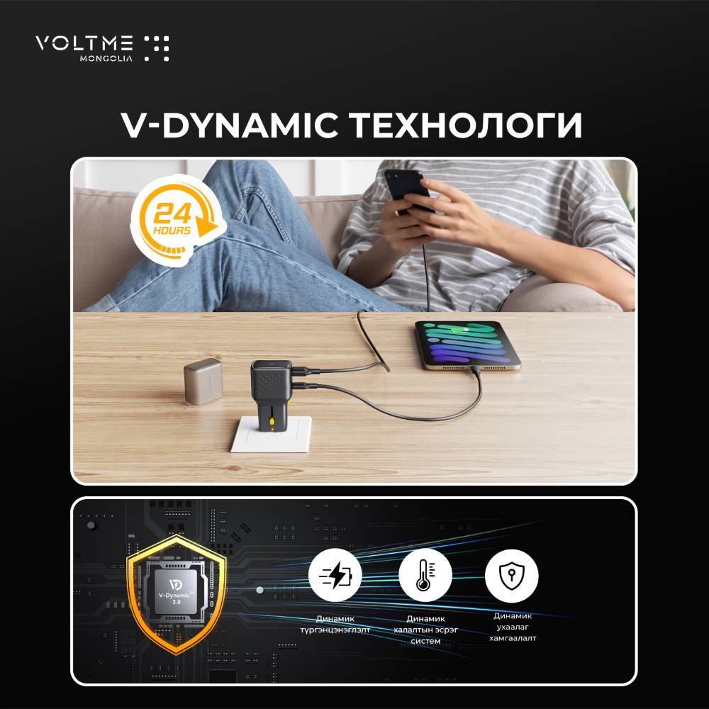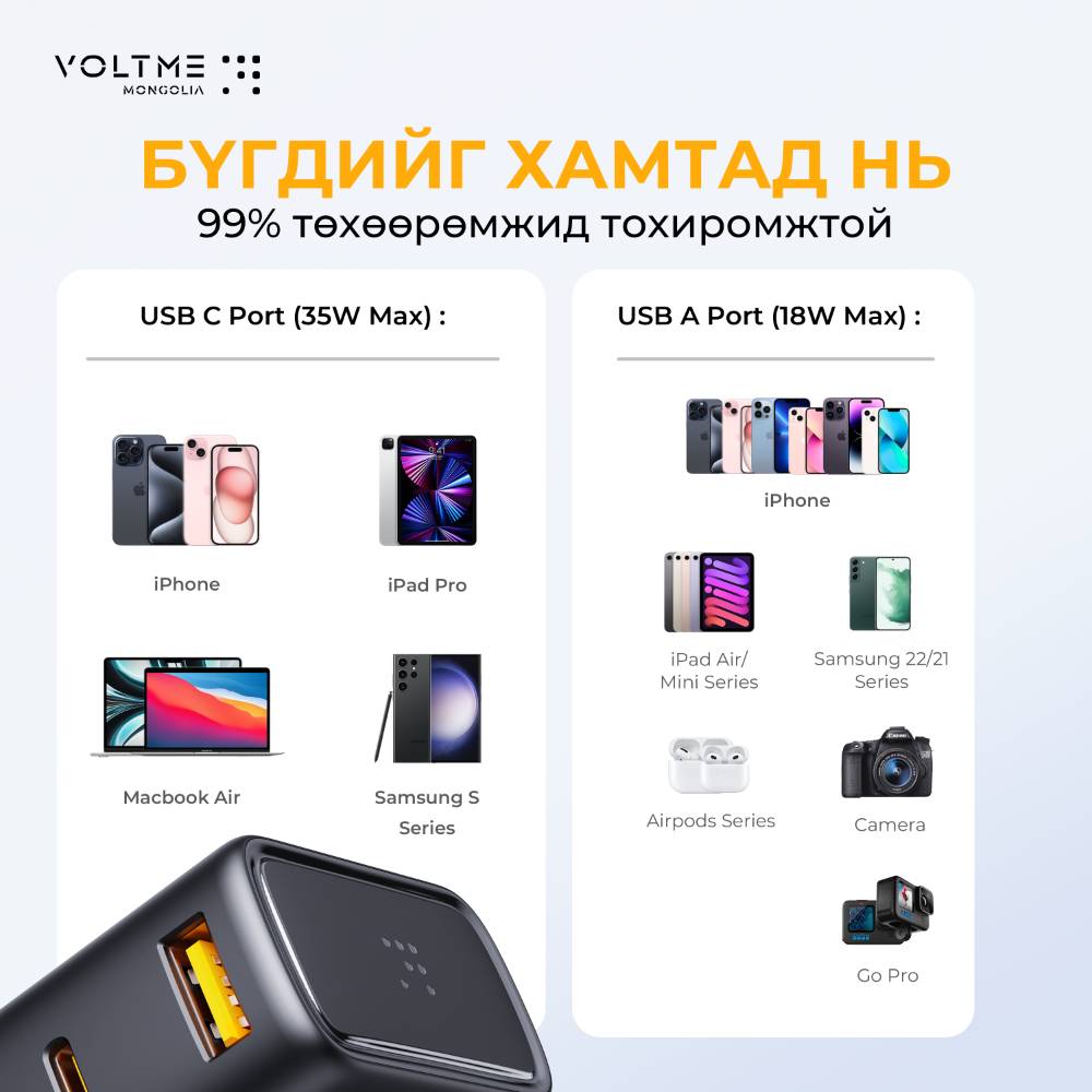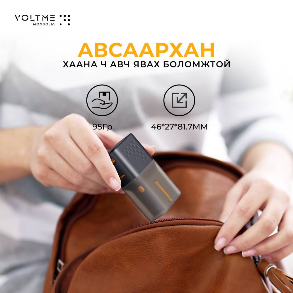 VOLTME брэндийн цэнэглэгч USB-C болон USB-A оролтын тусламжтайгаар зөөврийн компьютер, таблет, ухаалаг утас, чихэвч гэх мэт төхөөрөмжийг цэнэглэх боломжтой.