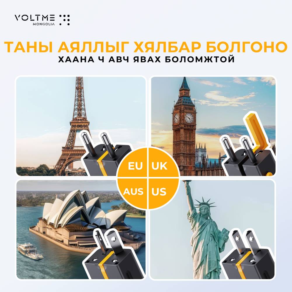 Дэлхийн хаана ч: Дэлхийн 200 гаруй улсад ашиглах боломжтой универсал цэнэглэгч.