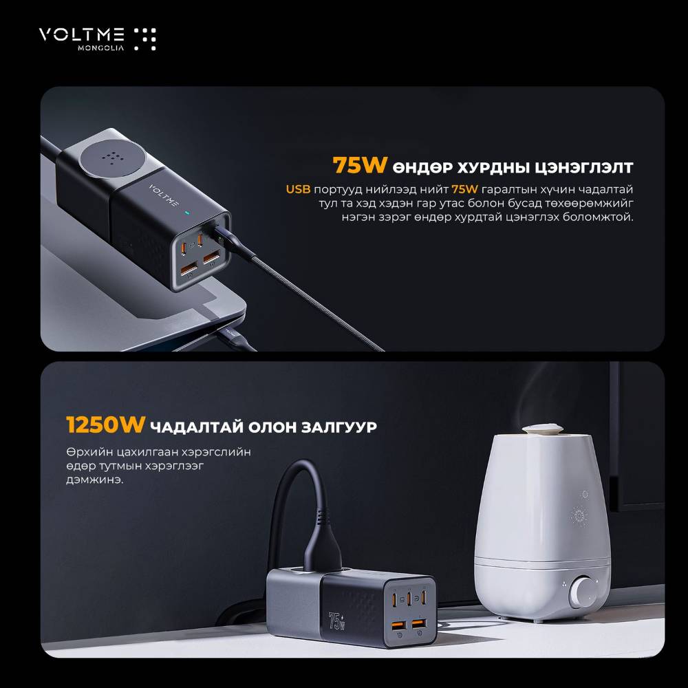 - Нэг дор 8 төхөөрөмж цэнэглэх боломжтой: 3 USB-C порт, 2 USB-A порт, 1 AC залгуур нийт 1250W чадал дэмжинэ. Laptop, гар утас, таблет зэрэг олон төрлийн төхөөрөмжтэй нийцтэй. Ингэснээр нэг цэнэглэгчээр бүх төхөөрөмжөө цэнэглэх боломжтой, маш уян хатан, хэрэглэхэд хялбар шийдэл болдог.