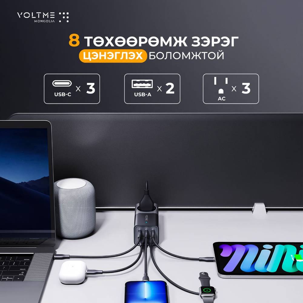 - Voltme VITO Go EzTravel Desktop Power Strip нь 3 USB-C порт, 2 USB-A порт болон нэмэлт 1 AC залгууртай, US стандартын дагуу нийт 8 төхөөрөмжийг зэрэг цэнэглэх боломжтой. VITO Go-ийн сайжруулсан хувилбар, чанартай хадгалах уут болон 1.2 м урттай 100W USB-C → USB-C цэнэглэх кабель дагалдана.